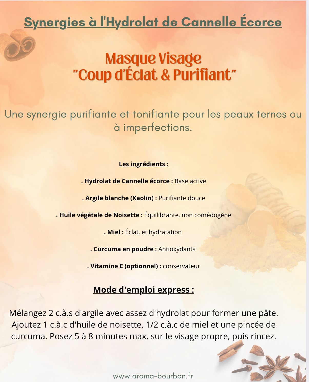 L’hydrolat de Cannelle écorce apporte un doux parfum épicé et chaleureux à vos cosmétiques maison et vous aide à retrouver joie et plaisir de vivre lorsque vous manquez de vitalité.